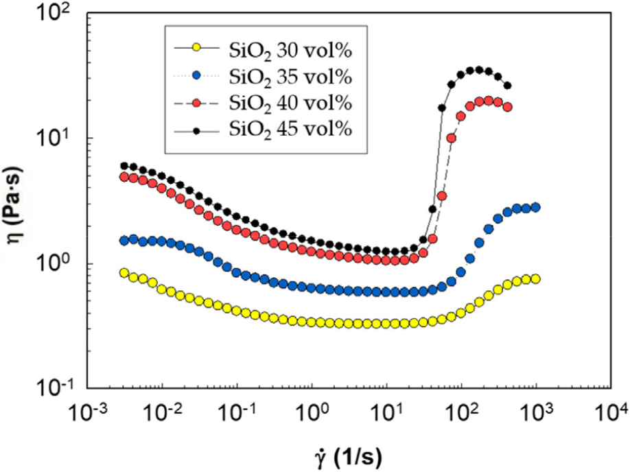 - This study investigates the rheological properties of shear thickening fluids (STFs) formulated by dispersing silica particles in polyethylene glycol (PEG), with the …