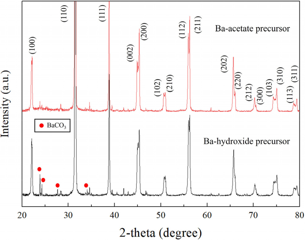 - We demonstrate a carbonate-suppressed hydrothermal route for synthesizing tetragonal BaTiO3 (BT) nanoparticles using barium acetate as the Ba source. Commercial TiO …