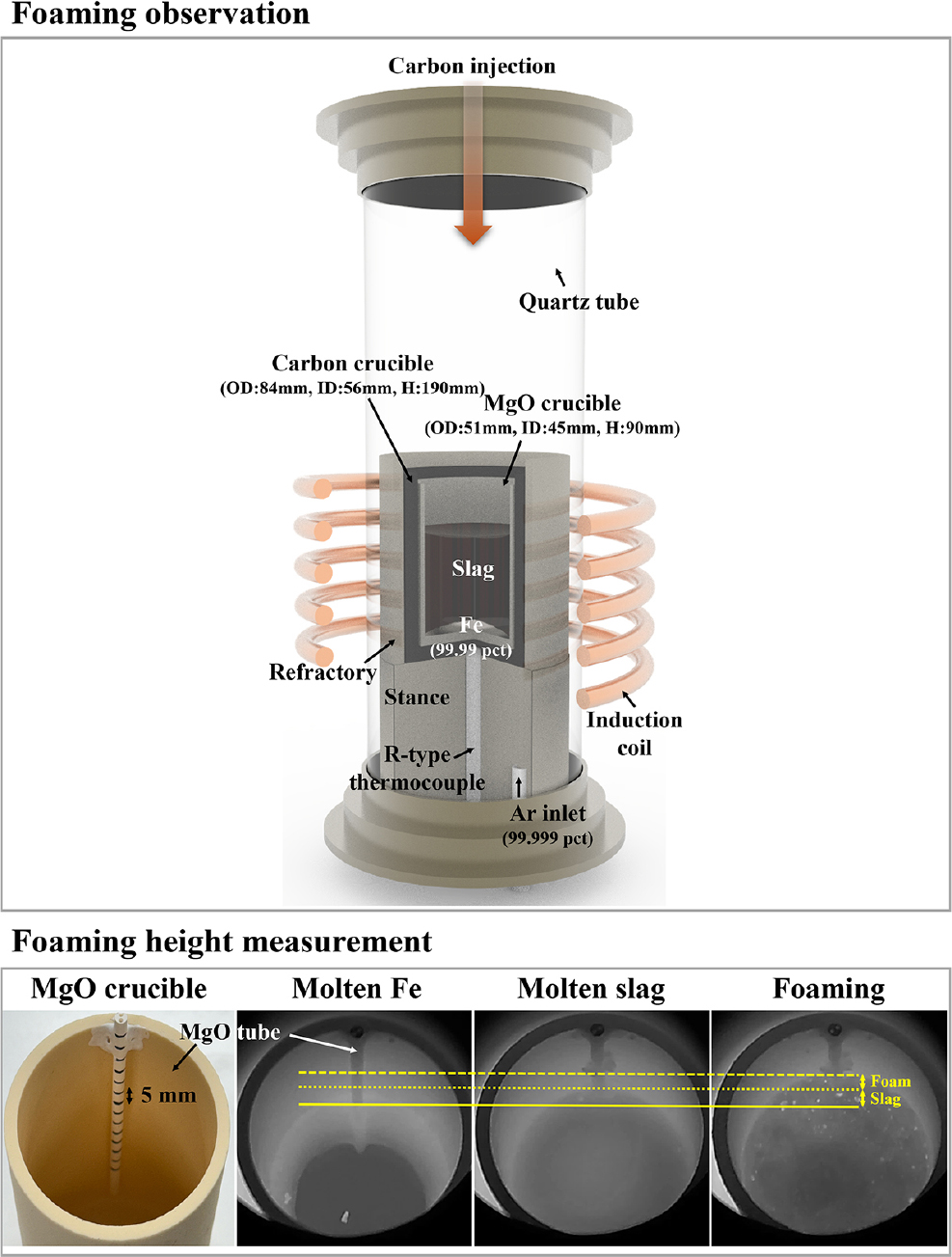- Electric arc furnace (EAF) steelmaking is increasingly adopting sustainable carbon sources to improve slag foaming and reduce energy consumption. Among them, spent tire-derived carbon represents a viable alternative to coal, offering high volatile and carbon contents. However, its elevated sulfur level and modified slag chemistry can markedly affect foaming stability and desulfurization. This study elucidates the interactive effects of spent tire substitution (0-30 wt%) and slag basicity (CaO/SiO2 = 1.5-2.4) on foaming dynamics, bubble evolution, and sulfur behavior at 1,600 °C. Real-time imaging and quantitative analyses demonstrated that moderate substitution (10-20 wt%) enhanced initial foaming due to volatile-induced gas release, whereas excessive addition (30 wt%) caused unstable coalescence and premature collapse from sulfur-driven surface tension reduction. Lower basicity limited early foaming but improved long-term stability via increased viscosity, while higher basicity promoted rapid collapse and reduced sulfur retention. The optimal condition (CaO/SiO2 = 2.0) maintained stable foaming for over 40 min, achieving superior sulfur capture (about 24 %) and minimal refractory attack. Overall, these findings reveal the mechanistic coupling between carbon source, basicity, and interfacial properties, offering practical guidance for sustainable slag design and efficient sulfur control in EAF operations employing waste-derived carbonaceous materials. - COLLAPSE