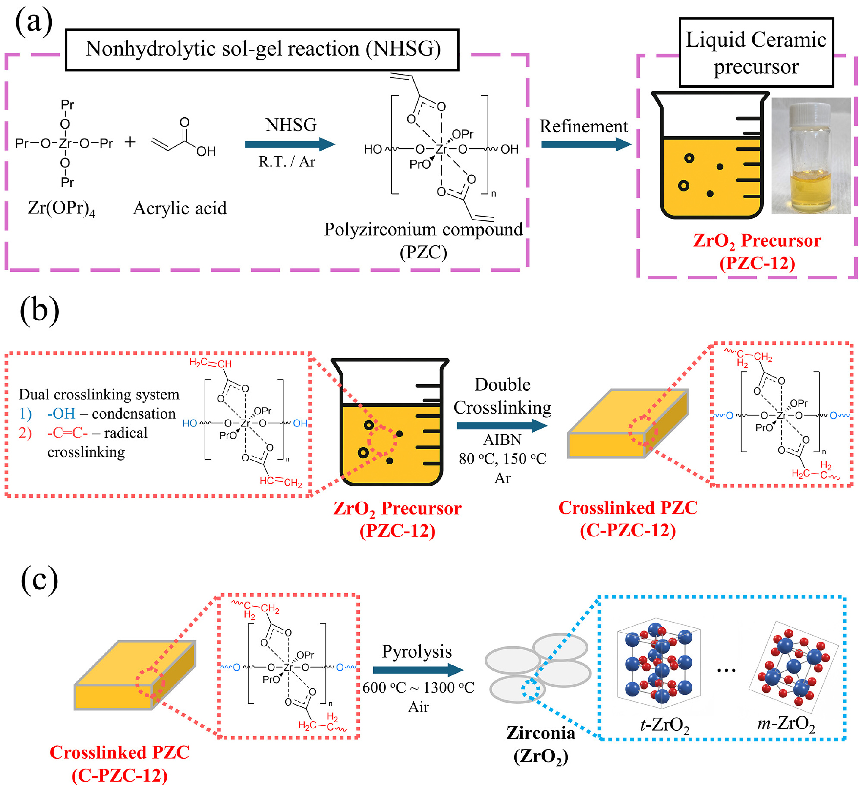 - Ultra-high temperature ceramics (UHTCs) exhibit extremely high melting points (> 2,500 °C) and maintain structural stability under severe conditions. However, their intrinsic brittleness and oxidation vulnerability limit their direct application in aerospace components exposed to extreme environments. To overcome these limitations, UHTC-based composites reinforced with secondary phases such as ZrO2 are required to improve fracture toughness and oxidation resistance. The polymer infiltration and pyrolysis (PIP) process provides a promising fabrication route for such composites, offering densification of porous matrices with liquid precursors while maintaining uniform microstructures. Here, we report a novel zirconia precursor (PZC-12) synthesized through a sol-gel reaction of zirconium propoxide with acrylic acid (1:2 molar ratio). The liquid precursor exhibited a suitable viscosity (~518 cP) and enabled dual crosslinking via hydroxyl condensation combined with radical polymerization of vinyl groups. Consequently, effective thermal curing was accomplished upon heating at 80 °C for 12 h. This strategy minimized premature decomposition and achieved a high ceramic yield of 52.7 %. Pyrolysis at 600 °C in air produced nanosized t-ZrO2, which transformed into m-ZrO2 with grain growth at higher temperatures. Applied in PIP, a ZrB2-ZrO2 composite was successfully fabricated, demonstrating that dual crosslinking is critical for high-yield, reliable PIP-based UHTC composites. - COLLAPSE