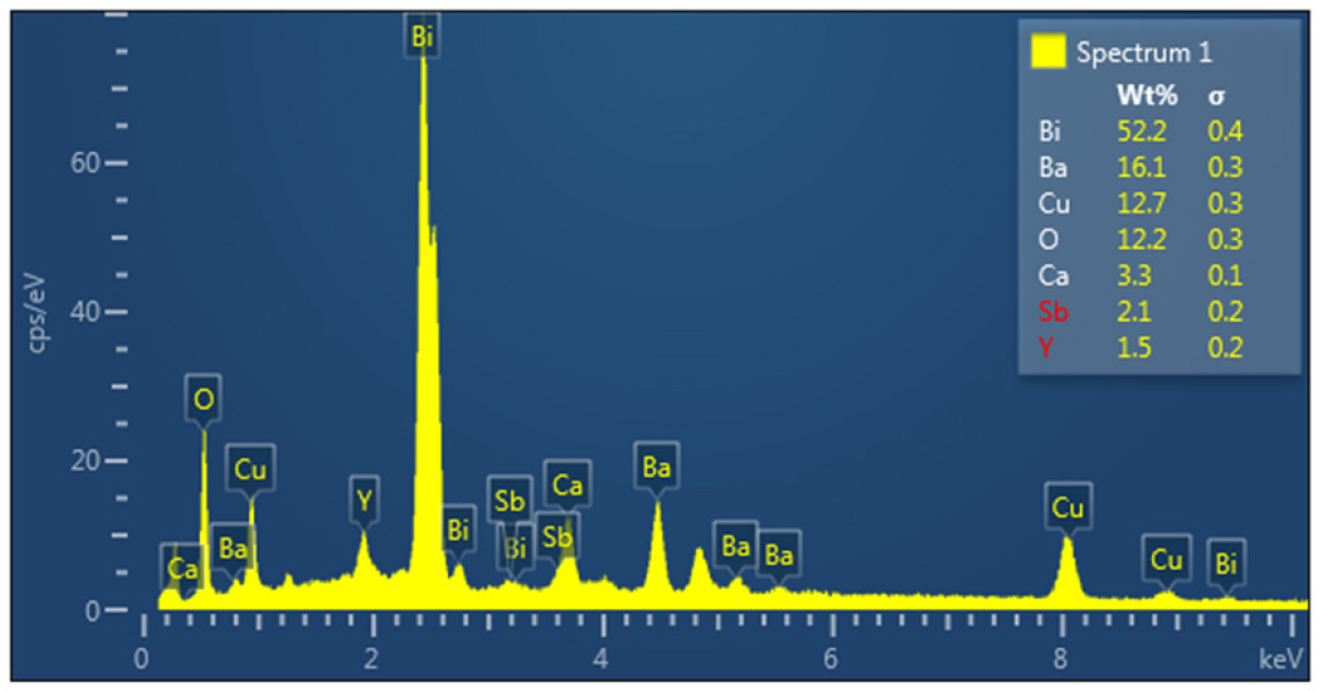 - Laser can be used to precisely and locally modify the properties of superconductors. Their crystal structure and charge distribution can be altered by applying focused energy, thus affecting their microstructure and electrical properties. This technique enables the design and development of new materials with enhanced performance for various applications. This paper focuses on the effect of laser irradiation on the thermal, structural, and electrical properties of the Bi1.9Sb0.1Ba1.9Y0.1Ca2Cu3O10+δ superconducting compound. Samples were exposed to heat for 48 h at 900 °C at a heating rate of 10 °C/min. X-ray diffraction (XRD) studies were performed and the diffraction results showed that all samples had a regular orthorhombic crystalline structure and that the lattice constants (a, b, c) changed with irradiation compared to the unirradiated sample. A significant increase in the c/a axis, lattice size high-temperature phase (HTP) was also observed after irradiation. The content of the high-temperature phase increased to 81.47 %. The topographical nature of the samples was examined using scanning electron microscopy (SEM), and a change in the formation of nanosized grains was found in the samples. Using an energy-dispersive X-ray spectroscopy (EDX) device, elemental analysis was performed to detect the presence of different elements and determine their proportions in each sample. The critical temperature was also determined. The results showed that when the sample was exposed to radiation, the highest critical temperature was 114 K. - COLLAPSE